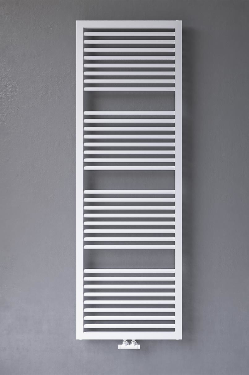 Scaldasalviette da bagno in acciaio con collettori laterali rettangolari 40x30 mm e tubo piatto orizzontale 20x40 mm saldobrasato. Mensole nascoste.