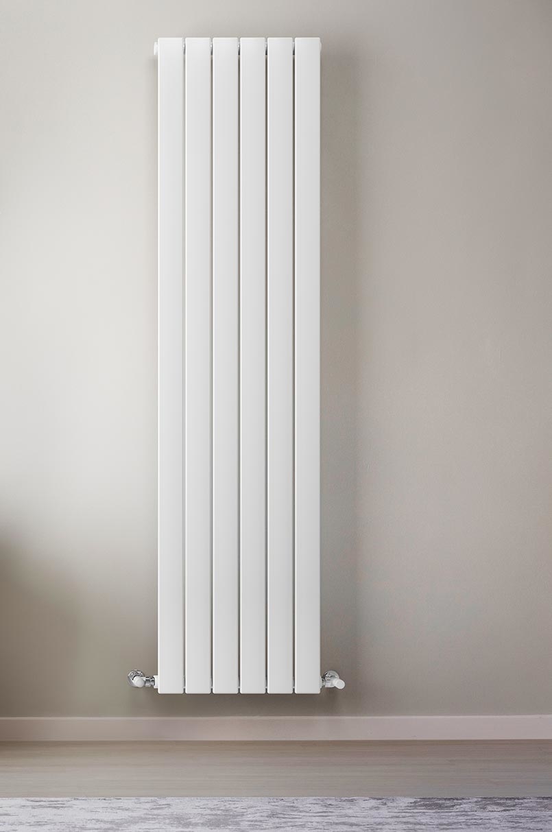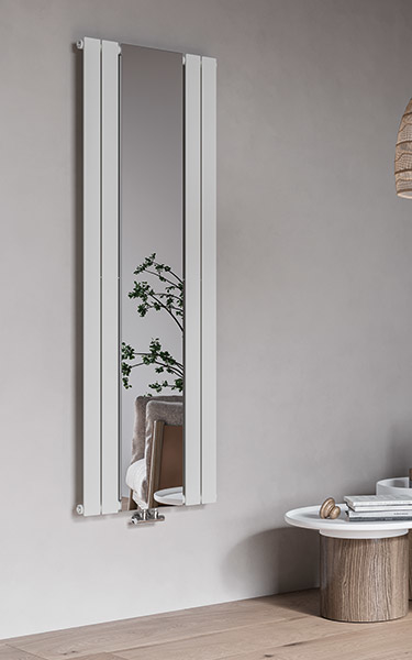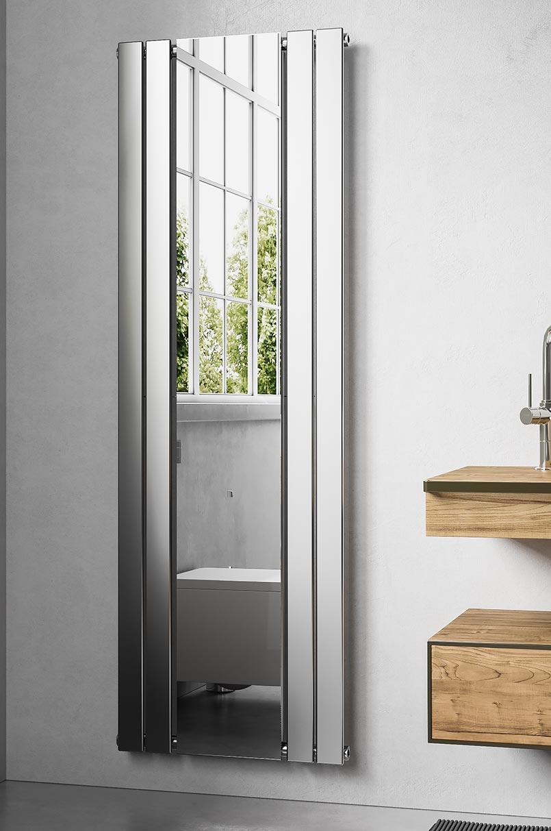 Radiatore d'arredo in acciaio con collettori tondi orizzontali dal diametro di 35 mm e tubo piatto verticale 70x11 mm. Specchio centrale integrato. Nessuna mensola a vista.