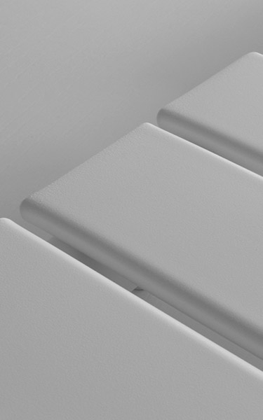 Radiatore d'arredo in acciaio con collettori tondi orizzontali dal diametro di 35 mm e tubi piatti verticali 70x11 mm in fila singola o doppia. Mensole nascoste.