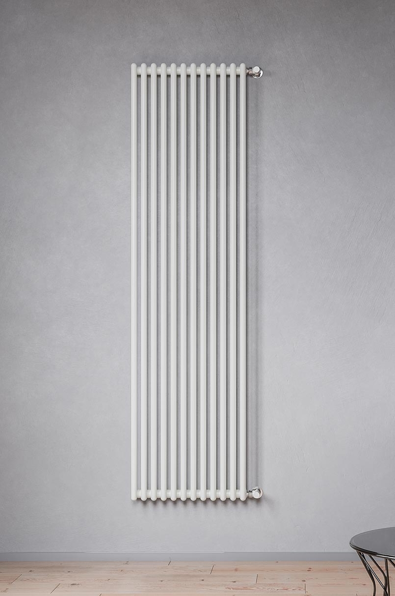 Radiatore d'arredo in acciaio con collettori tondi orizzontali dal diametro di 35 mm e tubi tondi verticali dal diametro di 22 mm in fila singola o doppia. Mensole nascoste.